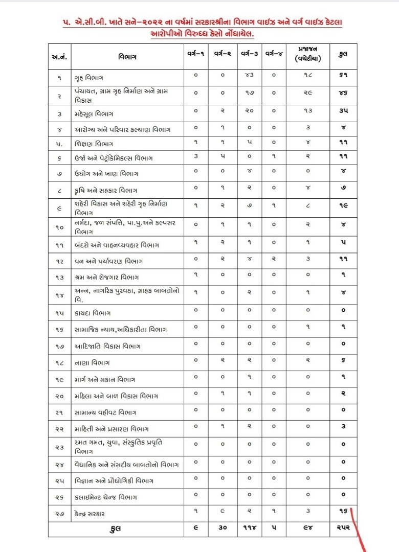 ગઈકાલે ભ્રષ્ટાચારના આંકડા જાહેર કરવામાં આવ્યા છે તેમ સૌથી વધુ વર્ગ 3 ના કર્મચારીઓ છે જે ગૃહવિભાગના સૌથી વધુ છે.લોક વાયકા પ્રમાણે સૌથી વધુ જો ભ્રષ્ટાચાર થતો હોય તો એ મહેસૂલ વિભાગમાં થાય છે જ્યારે બીજા નંબર પર માર્ગ અને મકાન વિભાગમાં.પરંતુ માર્ગ અને મકાન વિભાગમાં તો કરંટ રિપર્સની ગ્રાન્ટમાં સૌથી વધુ ભ્રષ્ટાચાર થતો હોય છે જેમાં વર્ગ 4 થી લઈને વર્ગ 1 સુધીના તમામની મિલીભગત હોય છે.