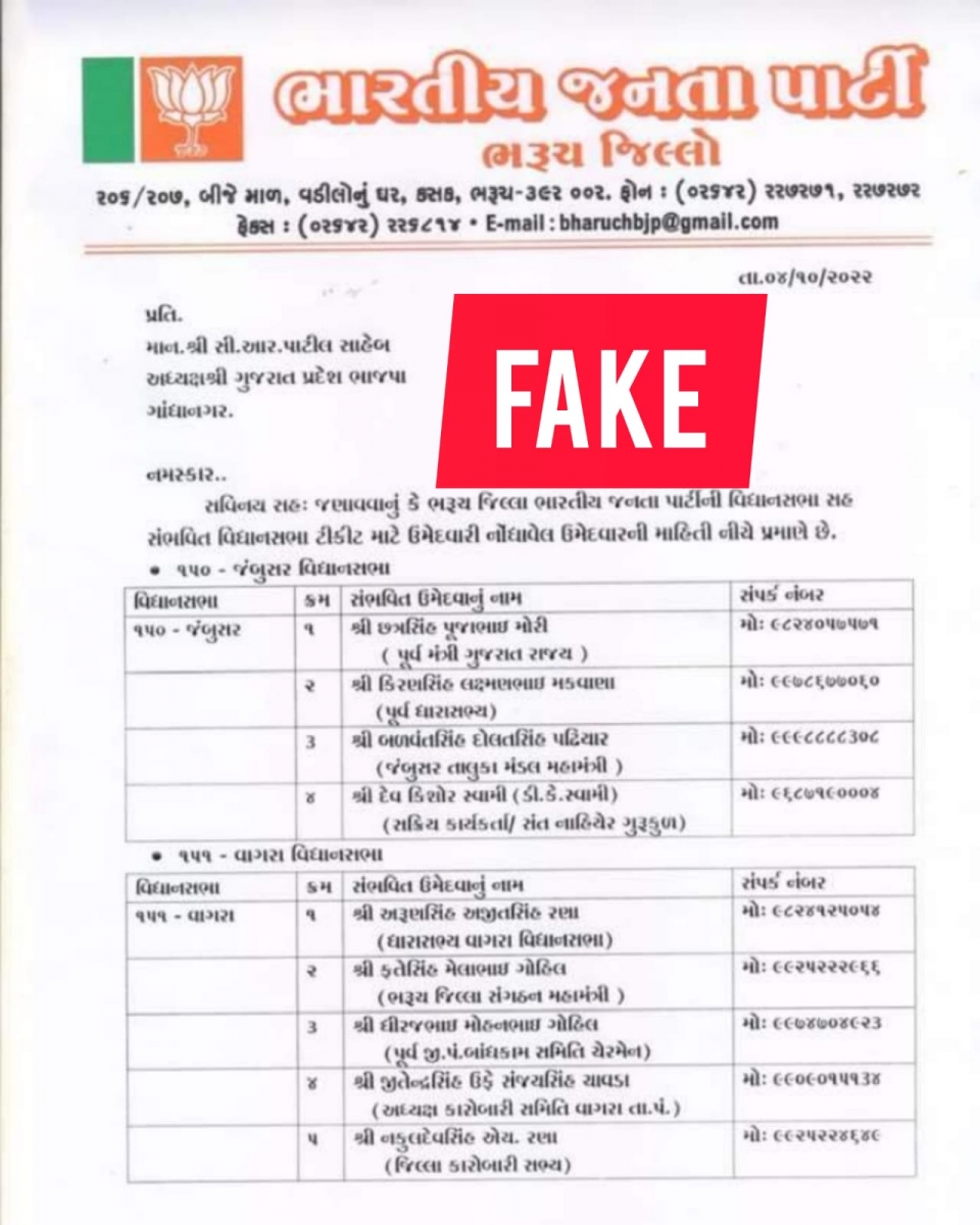 સોશ્યલ મીડિયા ઉપર ભાજપ પ્રદેશ પ્રમુખ સી.આર. પાટીલને સંબોધીને ભરૂચ ભાજપના લેટર પેડ ઉપર વાયરલ થયેલી સંભવિત યાદીમાં જંબુસર વિધાનસભા બેઠક માટે છત્રસિંહ મોરી,કિરણસિંહ મકવાણા,બળવંતસિંહ પઢીયાર,ડી.કે.સ્વામીના નામો રજૂ કરાયા છે.જ્યારે વાગરા બેઠક માટે અરૂણસિંહ રણા,ફતેસિંહ ગોહિલ,ધીરજ ગોહિલ,સંજય ચાવડા અને નકુલદેવ રણા સંભવિત ઉમેદવારોના નામનો સમાવેશ કરાયો છે.ભરૂચ જિલ્લા ભાજપમાં વાયરલ યાદીને લઈ ખળભળાટ વચ્ચે સાંસદ મનસુખ વસાવાએ આ યાદી બિલકુલ ખોટી અને તથ્યથી વેગળી ગણાવી છે.કોઈએ ભાજપના લેટર પેડનો ઉપયોગ કરી ટેક્નોલોજીની મદદથી આ કૃત્ય કર્યું હોવાનો સાંસદે પ્રતિક્રિયા આપી છે.આવું કામ કરનાર ઉત્સાહી ઉમેદવાર,મહત્વકાંક્ષી કાર્યકર કે અન્ય કોઈ જે પણ હશે તેની સામે પગલાં ભરવામાં આવશે તેવી પણ સાંસદે વાત કરી છે.જોકે સાચી હકીકત ગમે તે હોય યાદી બોગસ હોય કે પછી ભાજપનું પેપર ફૂટ્યું હોય હાલ તો આ યાદીને લઈ ભરૂચ જિલ્લા ભાજપ તેમજ રાજકારણમાં દિવાળી પેહલા જ આતશબાજી અને ધૂમધડાકા શરૂ થઈ ગયા છે.