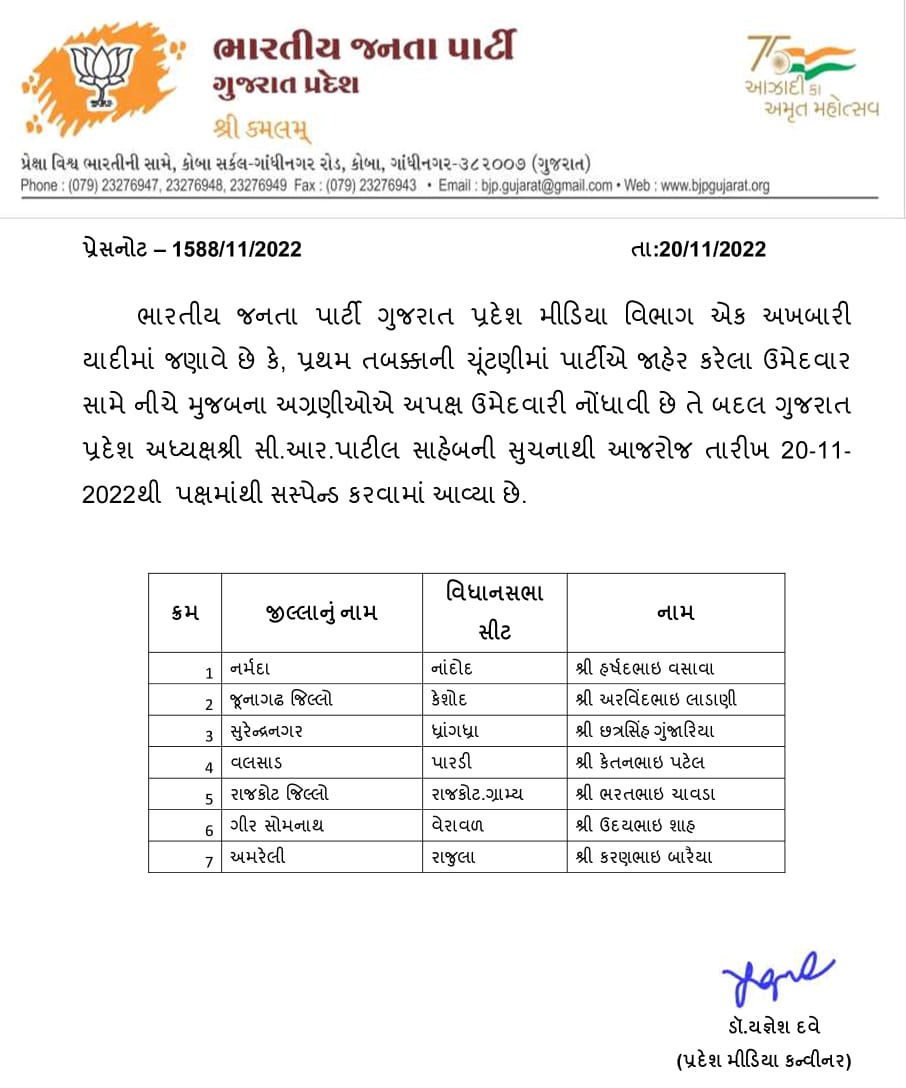 ગુજરાત વિધાનસભાની ચૂંટણીમાં ભાજપ દ્વારા પ્રથમ તબક્કાની 89 સહિત 160 બેઠકોની યાદી જ્યારે જાહેર કરવામાં આવી હતી ત્યારે કેટલાક ટિકિટ મેળવવા માટે ઉત્સાહિત કાર્યકરોના નામની જાહેરાત થઈ ન હતી અને તેમના બદલે અન્ય ઉમેદવારને ટિકિટ ફાળવવામાં આવી હતી. દરમિયાન આવા અસંતુષ્ટ કાર્યકરો અને નેતાઓએ પક્ષથી છેડો ફાડવાનું જાહેર કરી અપક્ષ ઉમેદવારી નોંધાવવાની જાહેરાત કરી હતી. પરિણામે આજે રવિવારે ભારતીય જનતા પાર્ટીના પ્રદેશ પ્રમુખ સી.આર.પાટીલ દ્વારા આ પ્રકારે અપક્ષ ઉમેદવારી નોંધાવનારા 7 નેતાઓને સસ્પેન્ડ કરી દીધા છે.