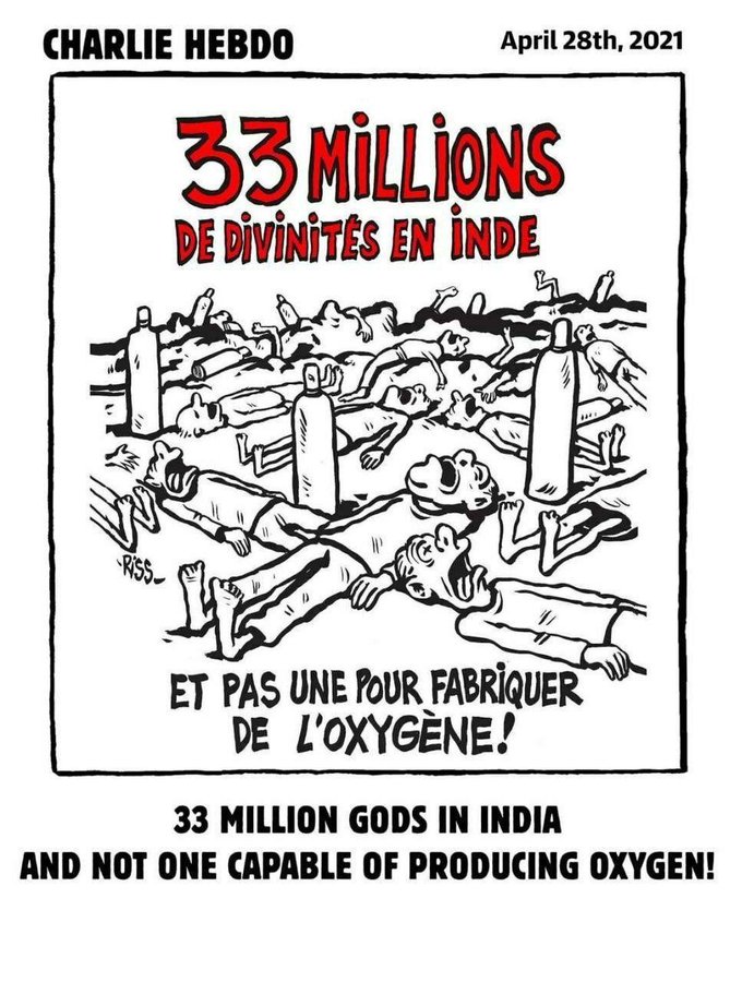 હકીકતે ફ્રાંસીસી મેગેઝિને એક કાર્ટુન જાહેર કર્યું હતું જેમાં ભારતમાં કોવિડ સંકટ અને ઓક્સિજનની તંગી સામે કટાક્ષ કરવામાં આવ્યો છે. 28મી એપ્રિલના રોજ પ્રકાશિત થયેલા આ કાર્ટુનમાં ઓક્સિજન માટે તરસી રહેલા ભારતીયોને જમીન પર સુતેલા બતાવવામાં આવ્યા છે. આ કાર્ટુનમાં હિંદુ દેવી-દેવતાઓની પણ મજાક ઉડાડવામાં આવી છે.કાર્ટુનના કેપ્શનમાં લખ્યું છે કે, 33 મિલિયન દેવી-દેવતા, પણ ઓક્સિજનનું ઉત્પાદન કરવામાં એક પણ સક્ષમ નહીં.