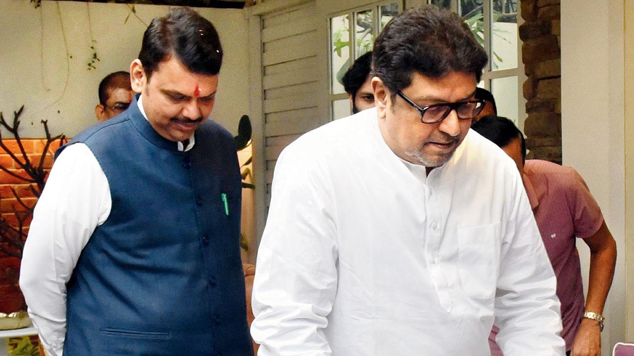 નાયબ મુખ્ય પ્રધાન દેવેન્દ્ર ફડણવીસે એમએનએસના નેતાના ઘરે દોઢ કલાક ચર્ચા કરતાં રાજ્યમાં નવી રાજનીતિ શરૂ થવાનાં એંધાણ વર્તાઈ રહ્યાંની ચર્ચા એકનાથ શિંદે જૂથ સાથે બીજેપીએ સરકારની સ્થાપના કર્યા બાદ ગઈ કાલે પહેલી વખત નાયબ મુખ્ય પ્રધાન અને રાજ્યના બીજેપીના ટોચના નેતા દેવેન્દ્ર ફડણવીસે મહારાષ્ટ્ર નવનિર્માણ સેના(એમએનએસ-મનસે)ના નેતા રાજ ઠાકરેની તેમના દાદરના ઘરની મુલાકાત લીધી હતી.બન્ને નેતાઓ વચ્ચે દોઢ કલાક લાંબી ચર્ચા થઈ હોવાથી રાજ્યના રાજકારણમાં કશી નવા-જૂની થવાની શક્યતા વ્યક્ત કરવામાં આવી રહી છે.