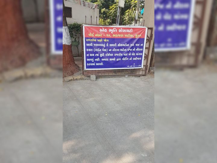 અડાજણની એક સોસાઈટીમાં ગાર્ડન વેસ્ટનો નિકાલ નહીં થતાં રાજકીય પક્ષોને મત માંગવા માટે સોસાયટીમાં પ્રવેશવા પર પ્રતિબંધ મૂકી દીધો છે.વોર્ડ નં.10 અડાજણ પાટિયાની સ્નેહ સ્મૃતિ સોસાયટીમાં બેનર લગાવી રહીશો દ્વારા વિરોધ કરાયો છે.બેનર પર લખાયું છે કે,‘અમારી સોસાયટીના ઝાડપાનના કચરાના નિકાલ માટેના પ્રશ્નનો નિકાલ ન થાય ત્યાં સુધી કોઈ પણ રાજકીય પક્ષોએ વોટ માંગવા આવવું નહી અમારા સભ્યો દ્વારા વોટીંગનો બહિષ્કાર કરવામાં આવશે.’
