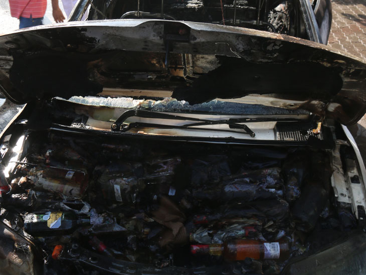 વરાછામાં ઇશ્વરકૃપા 3 રસ્તા પાસે આહિર સમાજની વાડી પાસે રસ્તા પર પાર્ક જીજે-05-આરસી-1685 નંબરની રેનોલ્ટની ક્વીડકારમાં આગ લાગી હતી.ફાયર બ્રીગેડને જાણ કરાતા ફાયર બ્રીગેડ આગ બુઝાવવા ગઈ હતી.ત્યારે કારમાંથી દારૂની ભરેલી 62 બાટલી અને 5 ખાલી મળી હતી.બોનેટની નીચે પણ બાટલીઓ સંતાડી રાખી હતી. પોલીસે પ્રોહિબિશનનો ગુનો દાખલ કર્યો હતો.પોલીસની તપાસમાં આ નંબર પ્લેટ બોગસ નીકળી હતી.