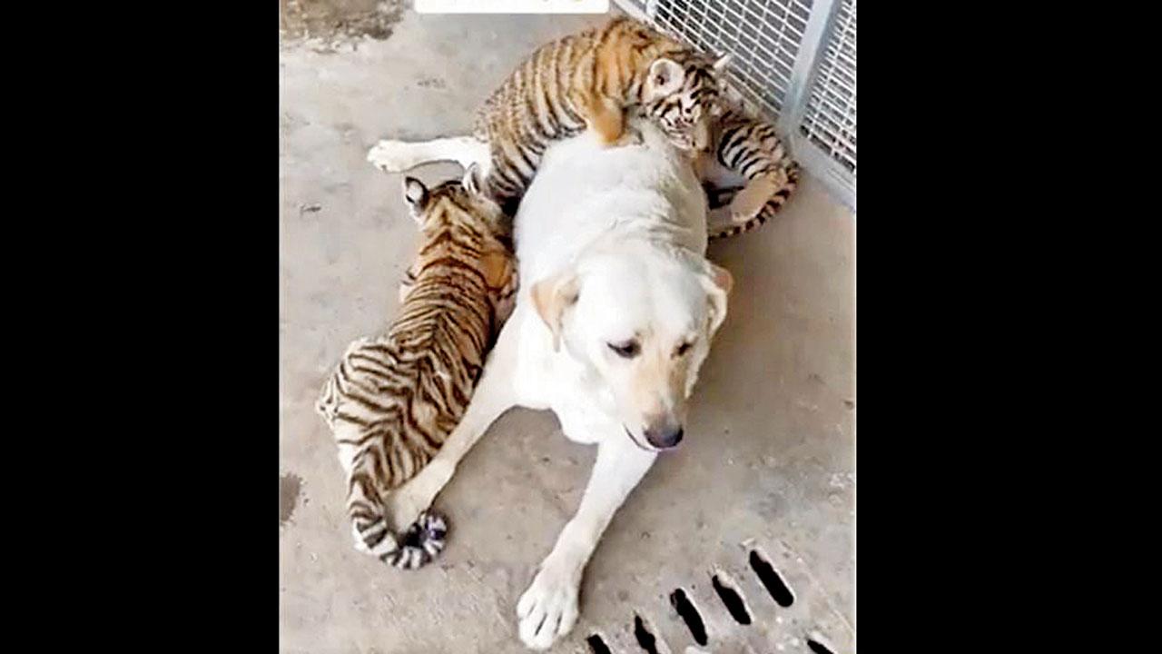 ઇન્ટરનેટ પર ફરી રહેલા ડૉગી સાથે વાઘનાં બચ્ચાંનો વિડિયો નેટિઝન્સને આશ્ચર્યમાં મૂકી રહ્યો છે.વાઘણે અકારણ ત્યજી દીધેલાં એનાં ત્રણ બચ્ચાંની સારસંભાળ લૅબ્રૅડોર પ્રજાતિની માદા ડૉગી રાખી રહી છે.ઇન્ટરનેટ પર ફરી રહેલા ડૉગી સાથે વાઘનાં બચ્ચાંનો વિડિયો નેટિઝન્સને આશ્ચર્યમાં મૂકી રહ્યો છે.આ વિડિયો ચીનનો છે,જ્યાં પાંજરા પાસે લૅબ્રૅડોરની આસપાસ રમી રહેલાં વાઘનાં ૩ બચ્ચાં જોઈ શકાય છે.બચ્ચાંઓએ એમની પાલક માતાને દિલથી સ્વીકારી લીધી હોય એવું આ વિડિયોથી જણાય છે.અત્યાર સુધી આ ક્લિપને ૧૬,૦૦૦ કરતાં વધુ વ્યુઝ મળ્યા છે.