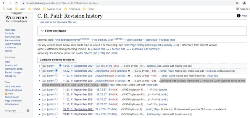 હકીકતમાં વિજય રૂપાણી બપોરે 2 વાગ્યાની આસપાસ રાજભવન પહોંચ્યા હતા, જ્યાં રાજ્યપાલ આચાર્ય દેવવ્રતને પોતાનું રાજીનામું સોંપ્યું હતું.જ્યારે સીઆર પાટીલના વિકિપીડિયા પેજ પર સવારે 10:46 કલાકના વર્ઝનમાં પ્રદેશ પ્રમુખને 17માં મુખ્યમંત્રી તરીકે દર્શાવવામાં આવ્યા હતા.જે બાદ લગભગ પોણા કલાક સુધી સીઆર પાટીલના વિકિપીડિયા પેજ પર તેમને મુખ્યમંત્રી તરીકે દર્શાવવામાં આવ્યા હતા.આ દરમિયાન 8 વખત સીઆર પાટીલના વિકિપીડિયા પેજને એડિટ કરવામાં આવ્યું હતું.જ્યારે 11:29 કલાકે પેજને જ્યારે એડિટ કરવામાં આવ્યું, ત્યારે ફરીથી પાટીલને ભાજપના પ્રદેશ પ્રમુખ તરીકે દર્શાવવામાં આવ્યા હતા.
